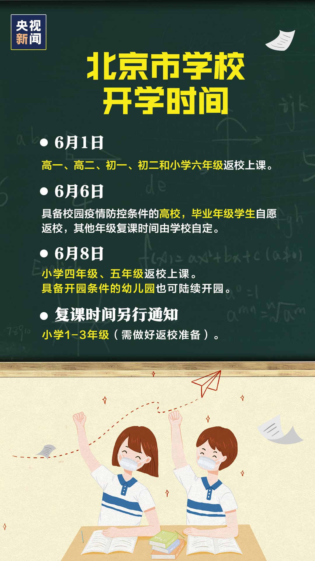 2020年6月6日起,具備校園疫情防控條件的高校,可安排畢業(yè)年級孩子自愿返校,其他年級具體復課時間由學校結(jié)合工作實際自定。
